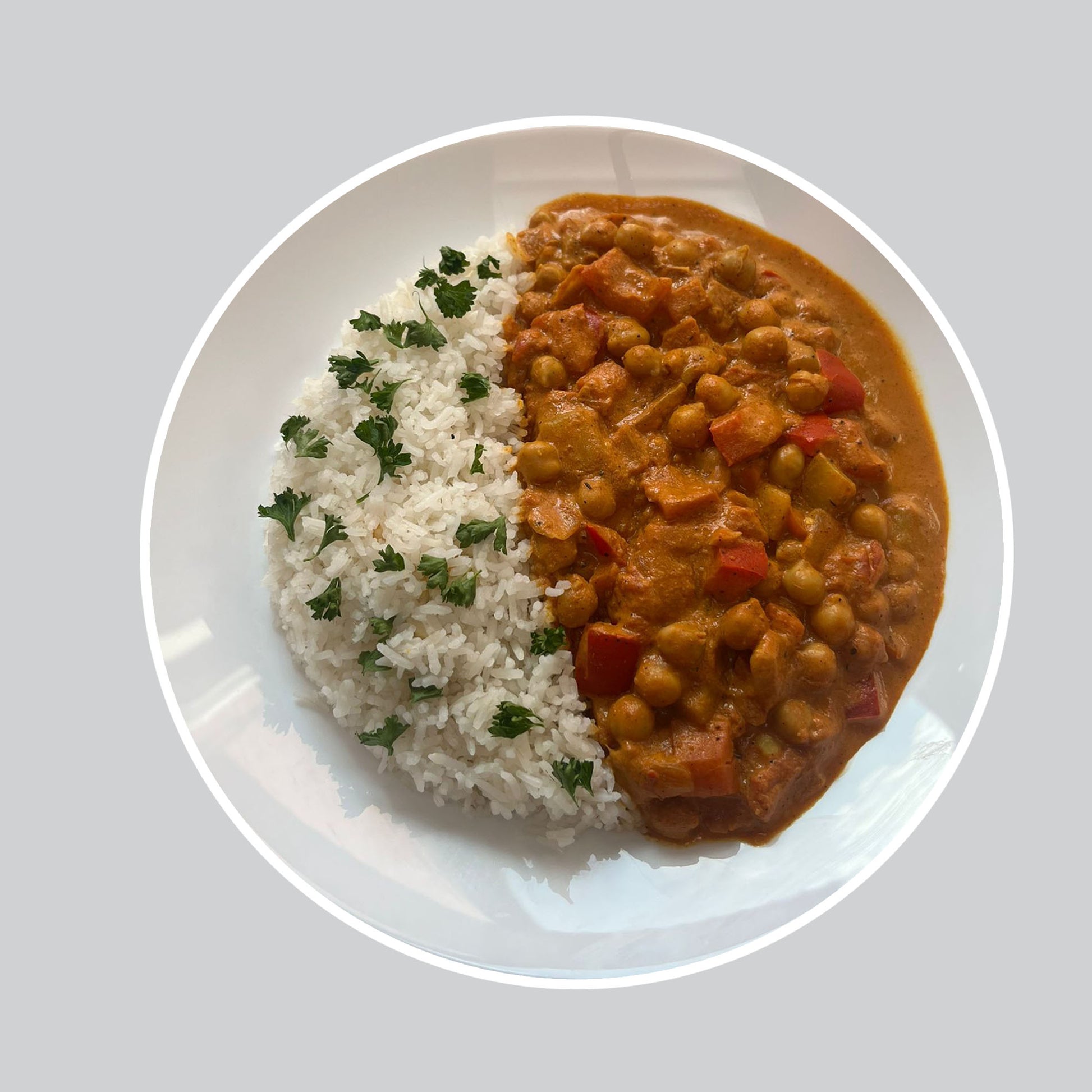Des pois chiches mijotés dans une sauce onctueuse au lait de coco, parfumée au curry et aux épices douces, accompagnés d'un quinoa léger et moelleux.